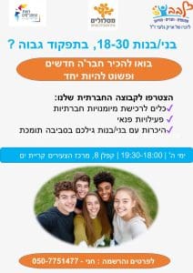 אם אתם בגילאי 20-30 מתמודדים עם ביישנות, חרדה חברתית, חוסר ביטחון עצמי, קושי נפשי, על הרצף ועוד… נשמח להכיר אתכם, לקבל ולאהוב אתכם בדיוק כמו שאתם.