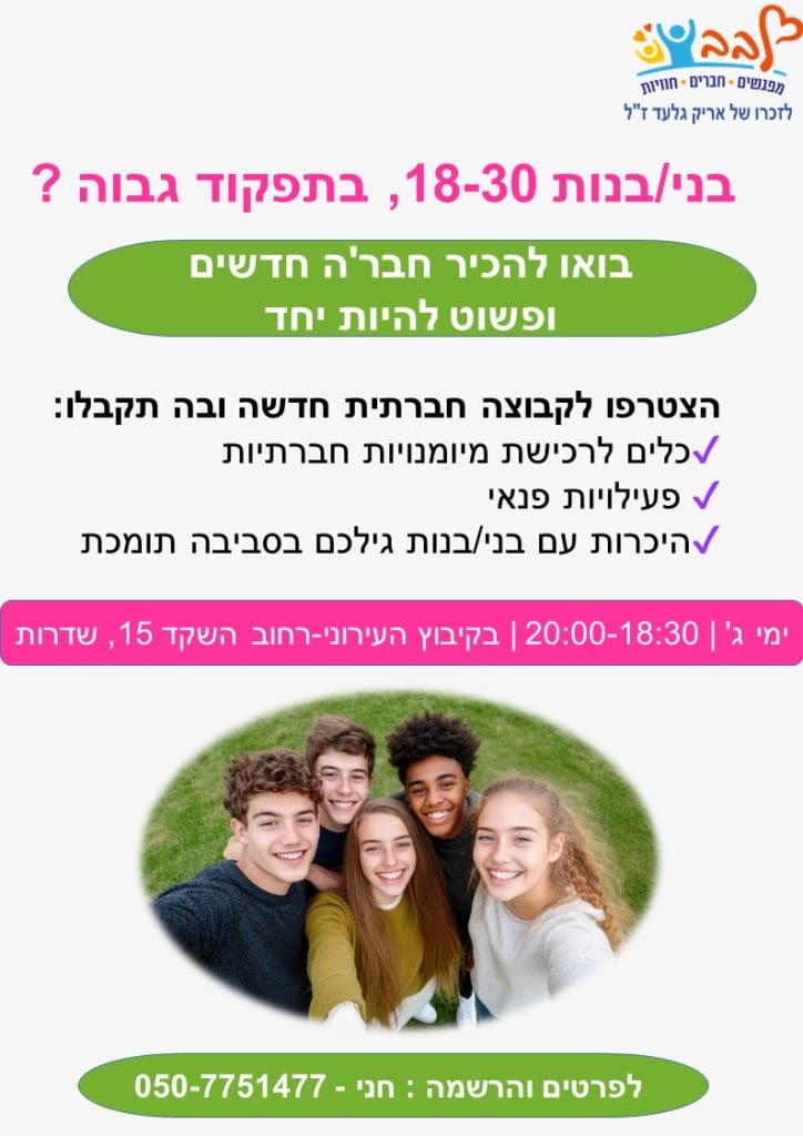 אם אתם בגילאי 18-30 מתמודדים עם ביישנות, חרדה חברתית, חוסר ביטחון עצמי, קושי נפשי, על הרצף ועוד… נשמח להכיר אתכם, לקבל ולאהוב אתכם בדיוק כמו שאתם.